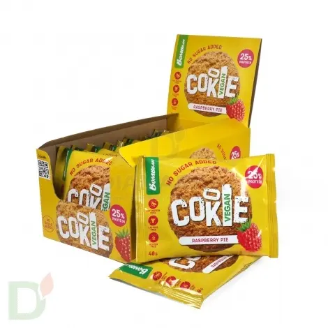 <h2>Изготовлено без ингредиентов животного происхождения</h2> Контролируете потребление животных продуктов? В поисках подходящего правильного перекуса? Мы сделали это за вас и рады представить очередную новинку: веган-печенье Bombbar! Приятный вкус, натуральные растительные ингредиенты, много орехов, польза и нереальное удовольствие. Если перекус - то только такой.<br> <h2>25% белка и минимум углеводов</h2> В составе печенья используются заменители молочного протеина: изолят горохового белка с добавлением растительных пищевых волокон. Этот десерт на 25% состоит из протеина, а поэтому дарит продолжительное и стабильное чувство сытости! На одно печенье приходится всего 2,4 грамма углеводов (некоторые диабетики смогут позволить его себе даже без подколки).<br> <h2>Печенье обогащено клетчаткой</h2> Еще одно неоспоримое достоинство веганского печенья - высокое содержание пищевого волокна: 10 грамм на 1 печенюшку. Это, кстати, 1/3 от рекомендованной суточной нормы. Достаточное потребление клетчатки - залог хорошего пищеварения.<br> <h2>Кому подойдет веган-печенье</h2> <ul> <li>веганам и вегетаринцам</li> <li> постящимся</li> <li> людям с аллергией на молочный протеин</li> <li> тем, кому по мед.показаниям запрещены продукты животного происхождения или молочные продукты</li> <li> всем, кто хочет разнообразия;)</li> </ul> Масса нетто: 40 грамм<br> <h2>Состав веганского печенья Малиновый Пирог</h2> белковая смесь(изолят горохового белка, изолят тыквенного белка), арахис, водорастворимые волокна кукурузы, олигофруктоза(пищевые волокна из цикория), вода, кокосовое масло, эритрит(подсластитель), малина, агенты влагоудерживающие (глицерин, сорбит), соль, корица, ароматизаторы натуральные, регуляторы кислотности (гидрокарбонат натрия(сода пищевая), лимонная кислота), эмульгатор(соевый лецитин), антиокислитель (аскорбиновая кислота), подсластитель - сукралоза, консервант (сорбат калия).<br> <br> <b>Содержит эритрит, при чрезмерном употреблении может оказывать слабительное действие.</b><br> <b> Может содержать незначительное количество миндаля, кешью, фундука, фисташки.</b><br> <h2>КБЖУ на печенье/40 грамм</h2> белки - 10г<br> жиры - 10г<br> углеводы - 2,4г<br> клетчатка - 10г<br> ккал - 160