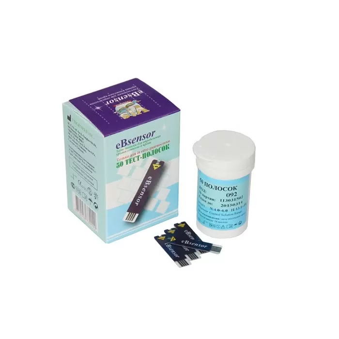 <p style="color: #333333;"> </p> <p> Тест-полоски еБсенсор предназначены для проведения домашнего экспресс анализа крови на сахар. Совместимы с одноименным глюкометром.  </p> <h2>Бюджетные тест-полоски еБсенсор </h2> <p> Ищете доступные по цене, но точные и простые в использовании тест-полоски? Вы их нашли.<br> Тест-полосками еБсенсор от тайваньской компании Visgeneer Inc. удобно измерять уровень глюкозы в крови, так как они довольно крупные и жесткие. Особенно оценят эту их особенность пожилые люди и пользователи с проблемами зрения. <br> Также несомненным достоинством этих тестов является то, что полоска сама втягивает необходимое для измерения уровня глюкозы количество крови. <br> Рабочая поверхность полосок защищена пластиковой оболочкой, поэтому ей не страшна грязь и вода.<br> Точность глюкометра еБсенсор соответствует требованиям международного стандарта ISO 15197.<br> <br> </p> <h2>Принцип работы</h2> <p> Технология, используемая для системы мониторинга уровня глюкозы в крови eBsensor, основана на применяемом в настоящее время во всех современных глюкометрах электрохимическом принципе. Суть его состоит в том, что во время реакции глюкозы крови с реагентом, нанесенным на реакционную область тест-полосок, создается слабый электрический ток и его величина пропорциональна количеству глюкозы в крови. Именно этот показатель пользователь глюкометра еБсенсор и видит на экране самого прибора.<br> Для проведения измерения используется капиллярная цельная кровь пациента. </p> <p>   </p> <p> <span style="font-family: var(--ui-font-family-primary, var(--ui-font-family-helvetica)); color: #383838; font-size: 1.866em; font-weight: bold;">Особенности хранения</span> </p> <p> Поставляются тест-полоски еБсенсор в запечатанных тубах. После вскрытия такой упаковки срок годности полосок составляет три месяца. Хранить их рекомендуется в оригинальной упаковке. <br> После того как тест-полоска была изъята из флакона для проведения анализа, необходимо обязательно плотно его закрыть во избежание попадания света и воздуха внутрь. Делается это для того, чтобы воздействия УФ-лучей, которое может негативно воздействовать на фермент теста Glucose Oxidase, необходимый для проведения анализа. <br> <br> </p> <h4><span style="color: #383838; font-family: var(--ui-font-family-primary, var(--ui-font-family-helvetica)); font-size: 1.6em; font-weight: bold;">Технические характеристики:</span></h4> <ul> <li>Объем капли крови: до 2.5 мкл;</li> <li>Время измерения: 10 секунд;</li> <li>Метод измерения: электрохимический;</li> <li>Калибровка: по плазме;</li> <li>Диапазон измерения: 1.66 ммоль/л - 33,33 ммоль/л;</li> <li>Диапазон гематокрита: 20%-60%;</li> <li>Рабочая температура: + 10 С до +40 С;</li> <li>Влажность при эксплуатации: меньше 85%;</li> </ul> <p> Срок годности тест-полосок еБсенсор в запечатанной пластиковой тубе составляет 24 месяца. После вскрытия упаковки – 3 месяца. </p> <br> <p> </p>