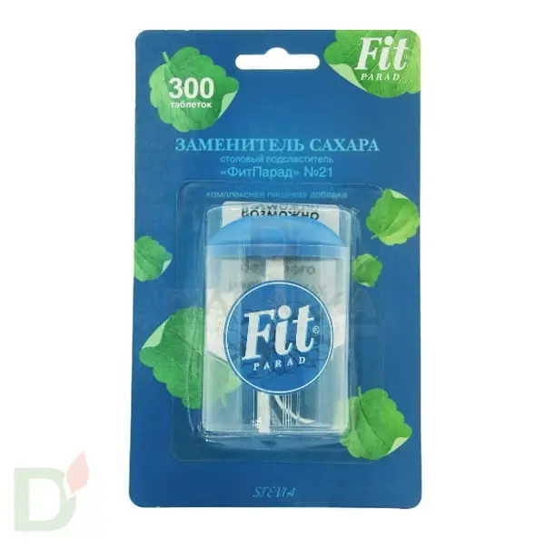 <p> ФитПарад № 21 заменитель сахара на основе стевии, 150 таблеток - инновационный сахарозаменитель. Обладает великолепным вкусом и улучшенными потребительскими свойствами благодаря сбалансированному составу тщательно подобранных компонентов.  Рекомендуем использовать для замены сахара при диабете и при диетах для снижения веса.<br> <br> <strong>Состав:</strong> подсластитель - стевиозид, разрыхлитель натрий двууглекислый, регулятор кислотности винная кислота, лактоза, L-лейцин, стабилизатор кроскармеллоза, антислеживающий агент - диоксид кремния, инулин.<br> <br> <strong>Пищевая ценность, в 100 г продукта:</strong> белки - 0 г., углеводы - 60,0 г., жиры - 0 г.<br> <br> <strong>Энергетическая ценность в 100 г продукта, кКал:</strong> 290 кКал / 1260 кДж.<br> <br> </p> <h1>1 таблетка "ФитПарад" №21 = 1 чайной ложке сахара</h1> <p> <br> Рекомендации по применению: перед употреблением растворить в жидкости. </p> <h2>Безопасная доза суточного потребления - 20 таблеток.</h2> <p> <br> <strong>Срок годности с даты изготовления: 2 года.</strong><br> <br> </p>