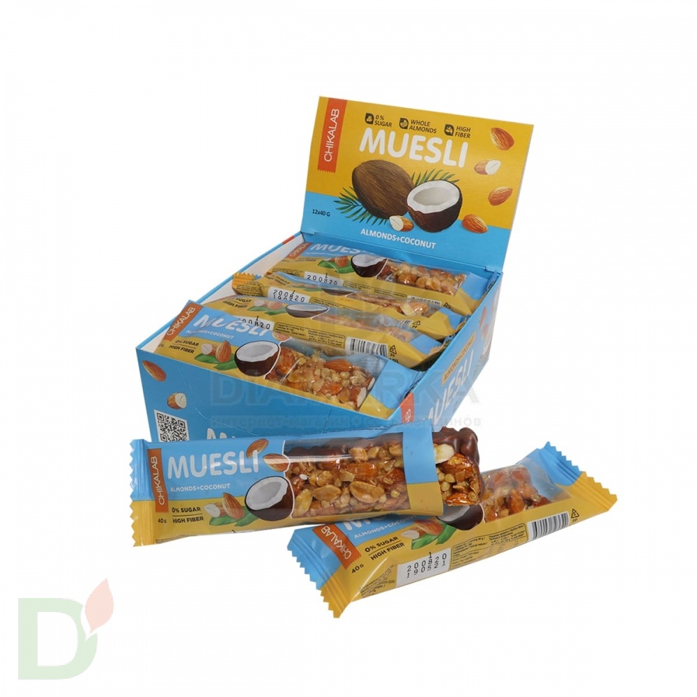 <h2>Польза злаков и орехов</h2> Новинка от Чикалаб - это много хрустящих орехов, капелька тающего шоколада и воздушных злаков. Как говорится все гениальное - просто! В основе мультизлаковых батончиков Чикалаб лежат миндаль, арахис, молочный шоколад и рисовые шарики. Вы только представьте сочетание этих вкусов. Бомба! Такой батончик - это питательный и сбалансированный перекус или десерт к чаю.<br> <h2>1 батончик содержит 5,4 углевода</h2> Но за счет содержания белка и полезных жиров углеводы эти медленные, поэтому употребление такого батончика не вызовет резкого роста сахара крови.<br> <h2>Злаковый батончик, как источник клетчатки</h2> Такой орехово-злаковый батон станет отличным дополнением к вашему дневному рациону: пополнит организм долгой энергией, правильными ненасыщенными жирами и клетчаткой!<br> <h2>Сладость для диабетиков и приверженцев пп-питания</h2> Мюсли подойдут абсолютно всем, ведь они не содержат сахара, вредных жиров, да и углеводов в них мало. Дети, беременные, диабетики, спортсмены, придерживающиеся диеты - все могут позволить себе такой перекус!<br> <br> Масса нетто: 40 грамм<br> <h2>Состав злаково-орехового батончика</h2> миндаль, кокос, молочный шоколад (водорастворимые волокна кукурузы, какао-масло, какао тёртое, молоко сухое обезжиренное, эмульгатор (соевый лецитин), ароматизаторы натуральные, подсластитель (сукралоза)), олигофруктоза (пищевые волокна), арахис, инулин(пищевые волокна), вода, кокосовое масло, рисовые шарики (рисовая мука, кукурузная крупа, соль), агент влагоудерживающий (глицерин), соль морская, ароматизаторы натуральные, эмульгатор (соевый лецитин), антиокислитель (аскорбиновая кислота), консервант (сорбат калия), натуральный подсластитель (стевиозид).<br> <h2>КБЖУ на 1 батончик/40 грамм</h2> белки - 5,3; жиры - 17; углеводы - 5,4; клетчатка - 8,9; 215 ккал.