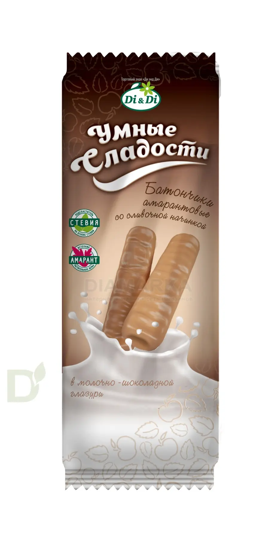<h2>Если захотелось сладкого</h2> Амарантовые батончики - отличная замена обычным сладким батончикам. Небольшая поправка: БОЛЕЕ ПОЛЕЗНАЯ замена! Они не содержат сахара, его аналогов, муки высшего сорта и других нежелательных компонентов. Хрустящие, ароматные, с нежной начинкой внутри и в шоколадной глазури снаружи. Попробуйте - вам точно понравится!<br> <h2>Преимущества амарантовых батончиков</h2> <ul> <li>низкая скорость усвоения углеводов</li> <li> меньше калорий (в сравнении с обычными сладкими батончиками)</li> <li> не провоцируют развития кариеса</li> <li> содержат клетчатку</li> <li> дополнительно обогащают рацион витаминами и микроэлементами</li> </ul> <h2>Что дает сладость</h2> Как было сказано выше, умные сладости не содержат сахара и его углеводных заменителей. Вместо них используются изомальт и стевия - природные низкокалорийные заменители, которые не оказывают на организм столь вредного воздействия, как сахар и аналоги.<br> <br> Масса: 20 грамм<br> <br> Срок годности 12 месяцев<br> <h2>Минеральные вещества в 100г</h2> Калий 107 мг 3,1% (% от РССН*)<br> Кальций 53 мг 5,3%<br> Магний 43 мг 10,7%<br> Фосфор 301 мг 37,6%<br> Железо 7 мг 46,0%<br> Натрий 6 мг 0,15%<br> <h2>Витамины в 100г готового продукта</h2> B1 тиамин 1,4 мг 93,3% (% от РССН*)<br> B2 рибофламин 1,6 мг 88,9%<br> PP ниацин 18,3 мг 91,5%<br> Bc фолиевая кислота 188 мкг 94,0%<br> B5 кальций Д-пантотенат 7 мг 87,5%<br> B6 пиридоксин 2 мг 100,0%<br> B12 цианокомбаламин 3 мкг 100,0%<br> C аскорбиновая кислота 60 мг 85,7%<br> H биотин 0,13 мг 86,7%<br> E токоферол 8 мг 80,0%<br> * Рекомендуемая средняя суточная норма потребления (РССН)<br> <h2>Состав батончика со сливочной начинкой в молочной глазури</h2> молочная глазурь( заменитель какао масла лауринового типа, подсластитель изомальт, сыворотка сухая молочная, мальтодекстрин, какао – порошок, молоко сухое обезжиренное и цельное, эмульгатор лецитин соевый, подсластитель стевиозид, ароматизатор «шоколад молочный», начинка сливочная (жиры нелауринового типа, подсластитель изомальт, мальтодекстрин, сыворотка сухая молочная, молоко сухое обезжиренное, эмульгатор лецитин соевый, подсластитель стевиозид, ваниль), мука рисовая грубого помола, мука амарантовая грубого помола, мука кукурузная тонкого помола, топинамбур сушеный, соль.<br> <h2>КБЖУ на 100 грамм батончика</h2> 444 ккал<br> б - 8,3<br> ж - 17,8<br> у - 62,8<br> 3,5 грамма клетчатки